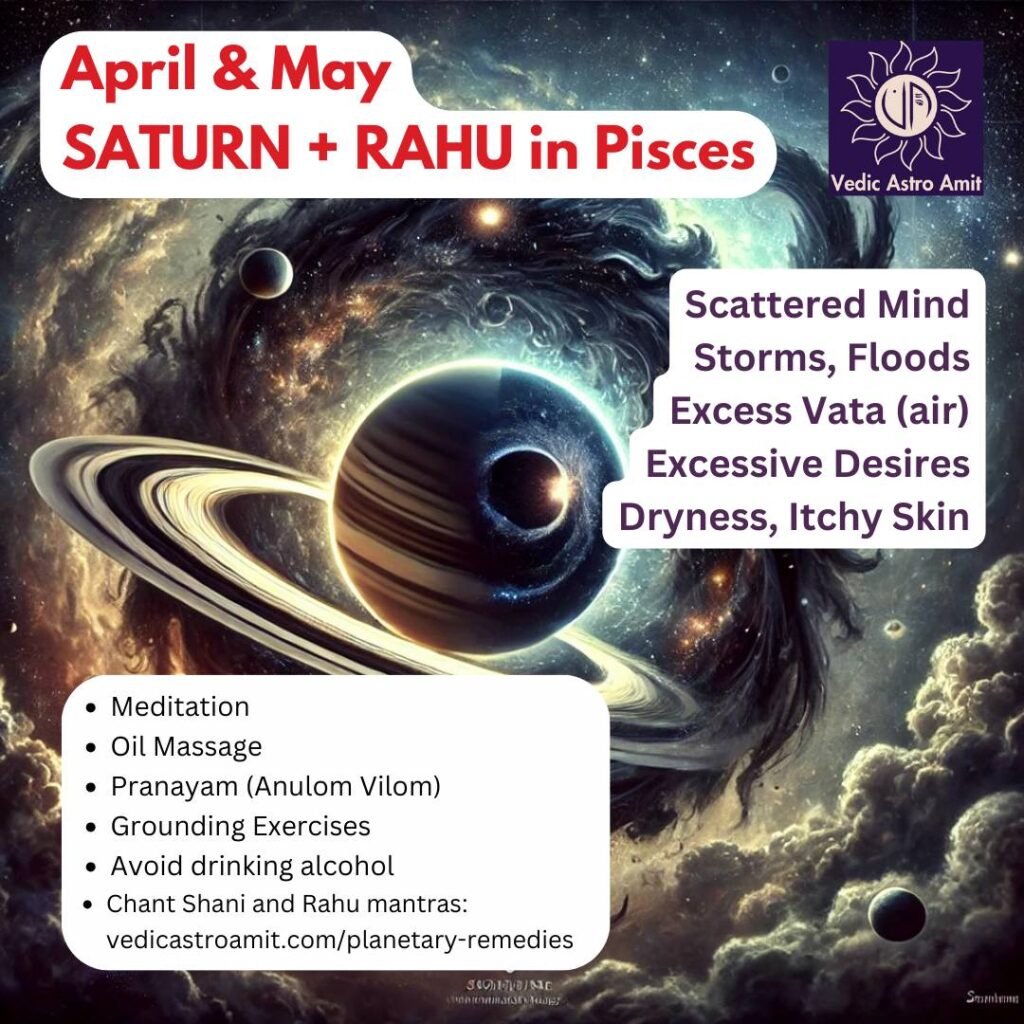 🌀 April & May: Expect a surge in desires, confusion about our path, scattered energy, and illusions. Externally, we will continue to see major weather calamities. 🔹 SATURN – The great karmic teacher, a powerhouse of Vata (Air) energy, bringing discipline, delays, and deep lessons.🔹 RAHU – A higher, intensified version of Saturn, amplifying restlessness, illusions, and uncontrollable desires. For April & May, these two giants are together in Pisces, creating a whirlwind of karmic shifts. ✨ If…