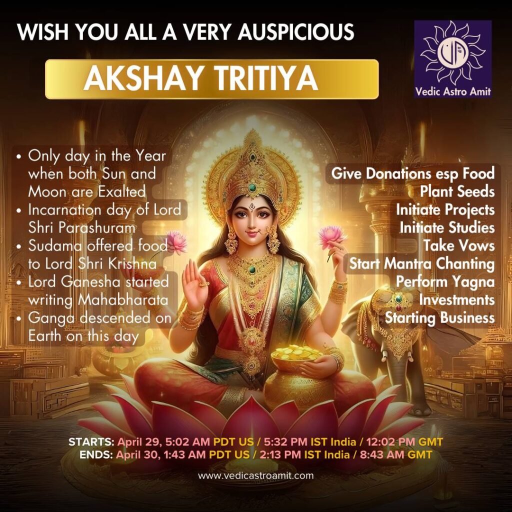 AKSHAY = that which cannot be destroyedTritiya = 3rd lunar day of the waxing phase in the lunar month of Vaisakha. Akshay TritiyaStarts: April 29, 5:02 AM PDT US / 5:32 PM IST India / 12:02 PM GMTEnds: April 30, 1:43 AM PDT US / 2:13 PM IST India / 8:43 AM GMT This is the only day in the whole Year when both the Sun and the Moon are exalted, radiating their fullest light and blessings! The universe is wide open to receive and multiply whatever you begin or offer on this day—be it wealth,…